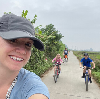 After lunch we immediately headed out by bike towards Trang An. Google maps had quite a few paths on it that we figured we would try out to stay off the main roads as much as possible. These paths were the quintessential biking through rice paddy fields, all I needed was a rice hat to really complete the moment. In true Google fashion, there was one section of trail that was a surprise moment of 'are you serious, this is where you want me to go?' It was a narrow dirt path with one bike tire width trench to navigate and rice paddy field water on both sides of the trail. The kids thought it was A-MAZING. It's one of those moments where you think, "ok what's the worst that could happen? They fall in the water and get all muddy? Ok, I guess that's not that bad."